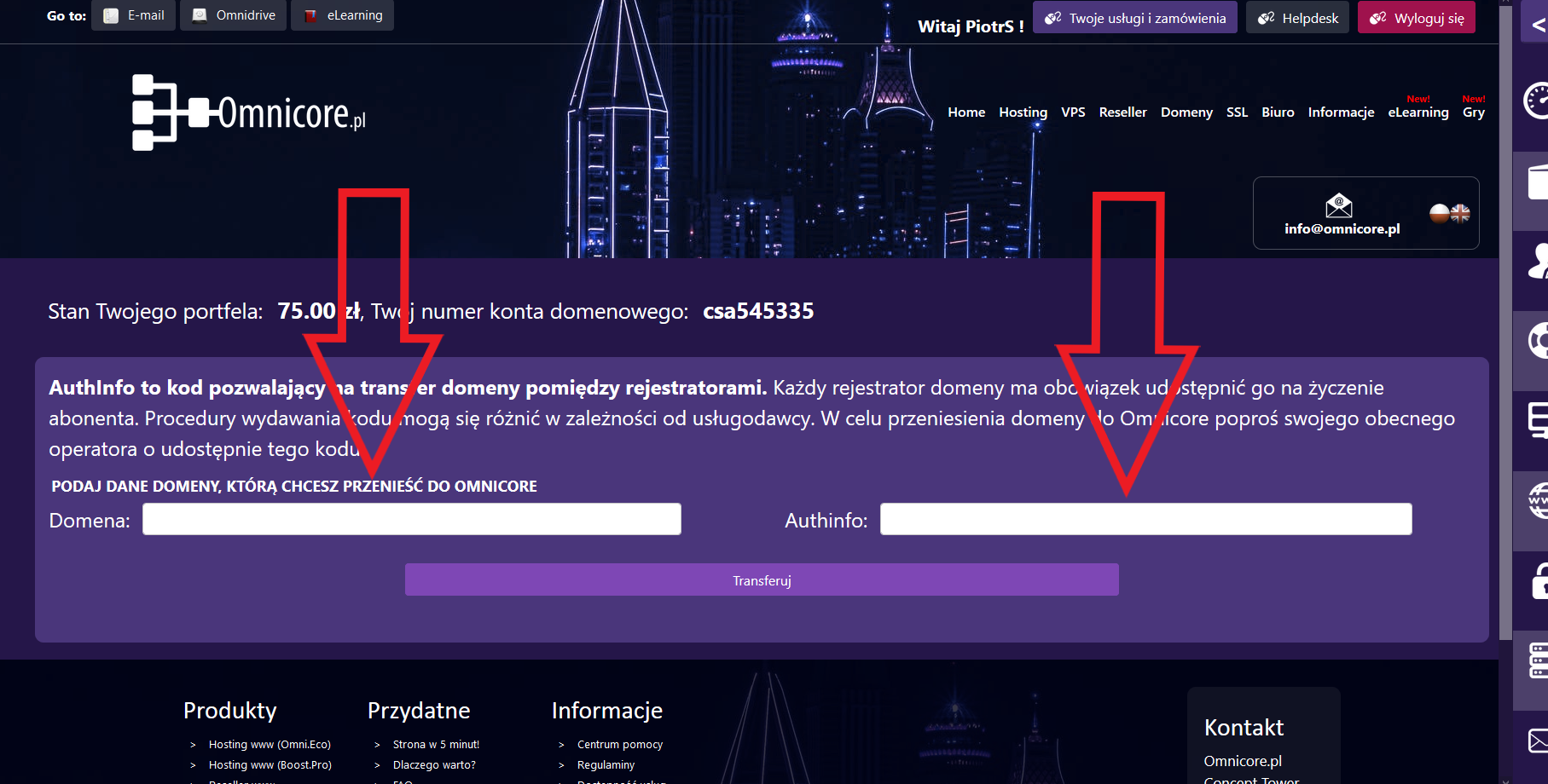 3. Wpisz kod Authinfo uzyskany od obecnego usługodawcy oraz nazwę domeny: